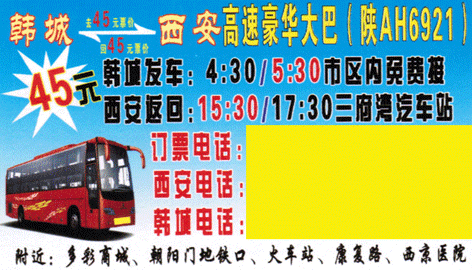 韩城到西安长途客车在韩城汽车站始发,目的到西安汽车,韩城到西安汽车途经地点及韩城到西安发车时间,韩城到西安承揽团体大巴租赁包车,可 以通过西安到韩城汽车随车电话联系业务。
