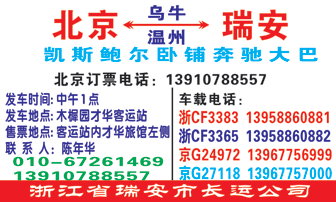 从 北京(木樨园客运站) 发往 瑞安新东站 班车途经及时间: