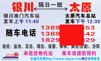 银川到太原汽车联系电话:, 。太原到银川汽车在太原客运汽车站发车时间终点站.银川到太原客车在银川汽车客运站发车时间:11:40。银川到太原承揽大巴租赁业务,太原到银川汽车随车电话联系我们。太原到银川汽车途经:太原汽车总站、汾阳、吕梁、离石、柳林、绥德、靖边、定边、盐池、银川南门汽车站、。信息由长途汽车网提供,需要更多长途汽车信息请到长途汽车查询www.ctqcw.com!!!
