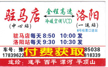 驻马店到洛阳汽车随车电话:未经车主授权,暂不能发布随车电话。洛阳到驻马店汽车在洛阳客运站发车时间终点站.驻马店到洛阳客车在驻马店汽车站发车时间:7:40。驻马店到洛阳承揽大巴租赁业务,洛阳到驻马店汽车随车电话联系我们。洛阳到驻马店汽车途经:洛阳、驻马店、。信息由长途汽车网提供,需要更多长途汽车信息请到长途汽车查询长途汽车网查询!!!